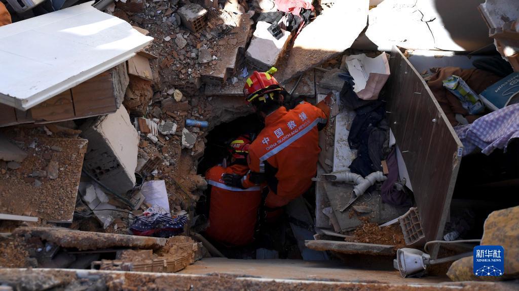 2月9日,中國救援隊隊員在土耳其哈塔伊省安塔基亞市深入受損建筑開展救援工作。