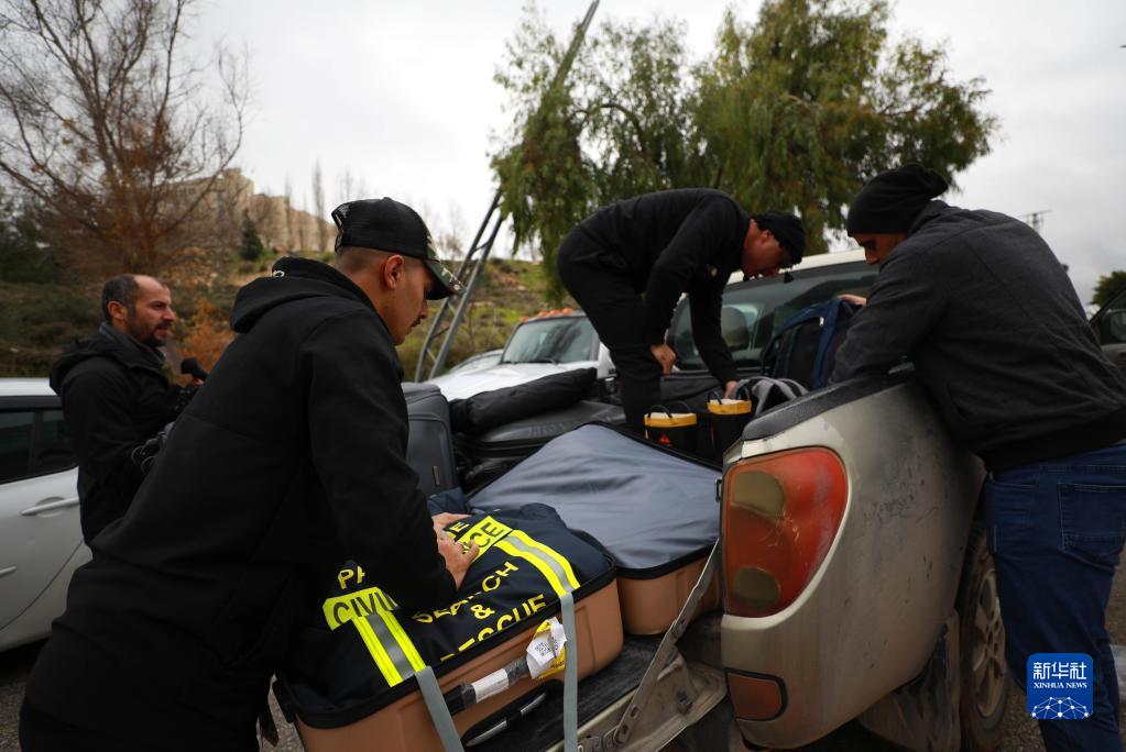 2月9日,在約旦河西岸城市拉姆安拉,巴勒斯坦救援隊隊員將救援物資裝車。