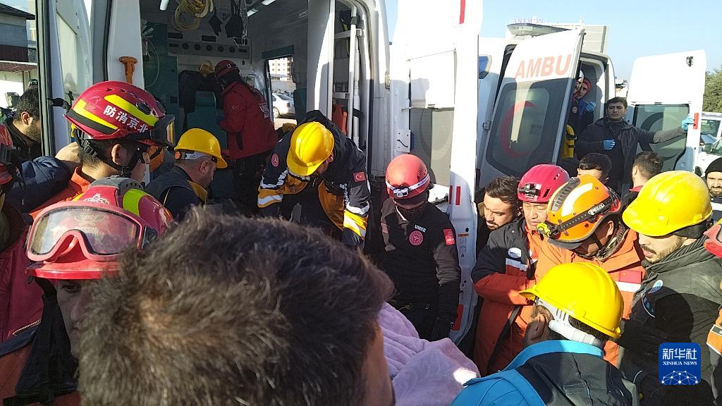 在土耳其南部地震重災區哈塔伊省安塔基亞市,中國救援隊同土耳其救援隊合作,于當地時間9日下午救出一名被埋在樓房廢墟下的女性幸存者。新華社記者 王騰飛 攝