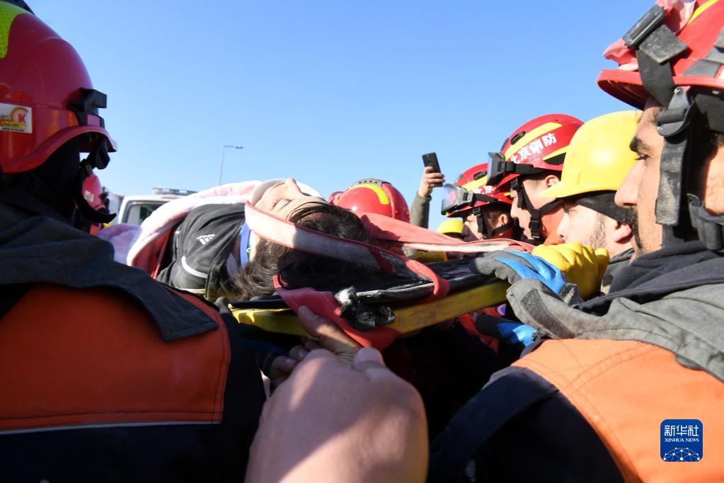 2月9日,在土耳其哈塔伊省安塔基亞市,中國救援隊(duì)與土耳其救援隊(duì)轉(zhuǎn)移一名救出的女性幸存者。