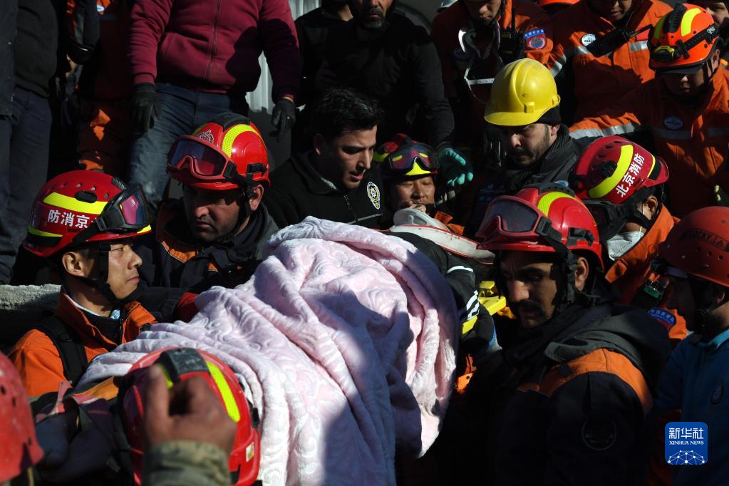9日,在土耳其南部地震重災區哈塔伊省安塔基亞市,中土救援隊聯手救出兩名地震幸存者。