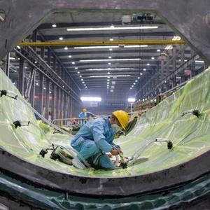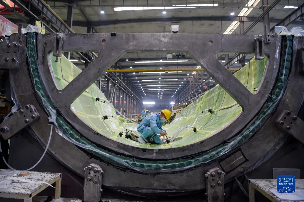 2月9日,工人在株洲時代新材料科技股份有限公司蒙西分公司風力發電葉片生產車間內作業。