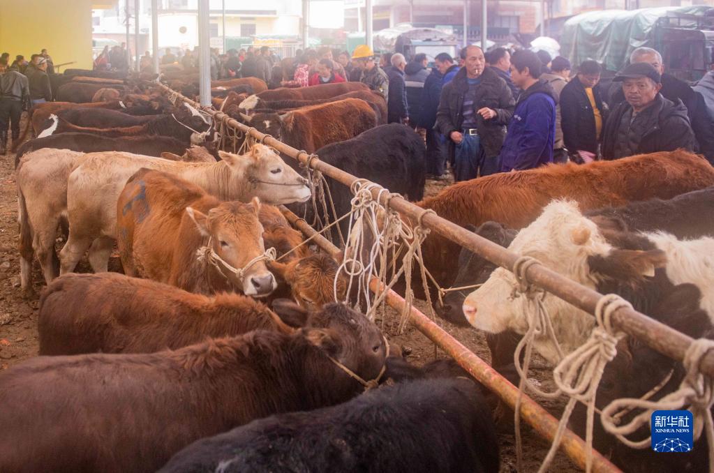 2月9日,在湖南省永州市道縣壽雁鎮(zhèn)活牛交易市場,農(nóng)戶在選購耕牛。