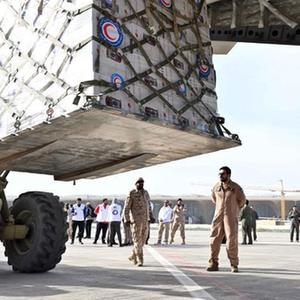 2月9日,工作人員在科威特費(fèi)爾瓦尼耶省的科威特國際機(jī)場裝載人道主義援助物資。