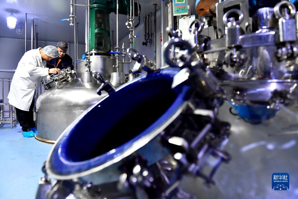 2月10日,泰山產(chǎn)業(yè)領(lǐng)軍人才劉建洋(左)在一公司車(chē)間查看肝素鈉提取情況。