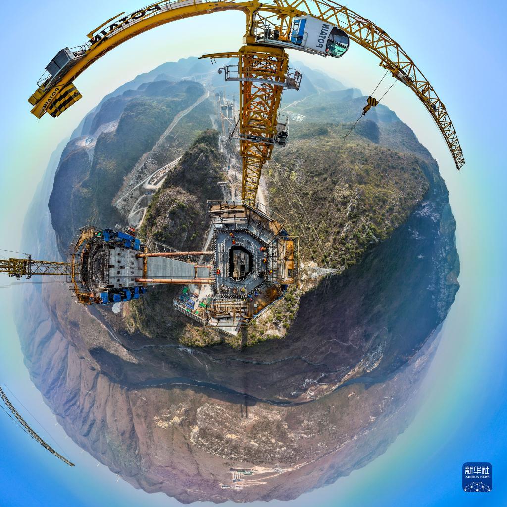 2月1日拍攝的花江峽谷大橋施工現(xiàn)場(無人機(jī)全景照片)。