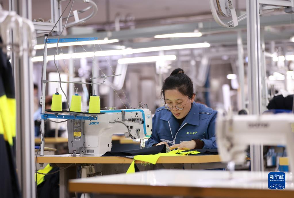 工人在河北內(nèi)丘一家制衣企業(yè)生產(chǎn)車間工作(2月9日攝)。