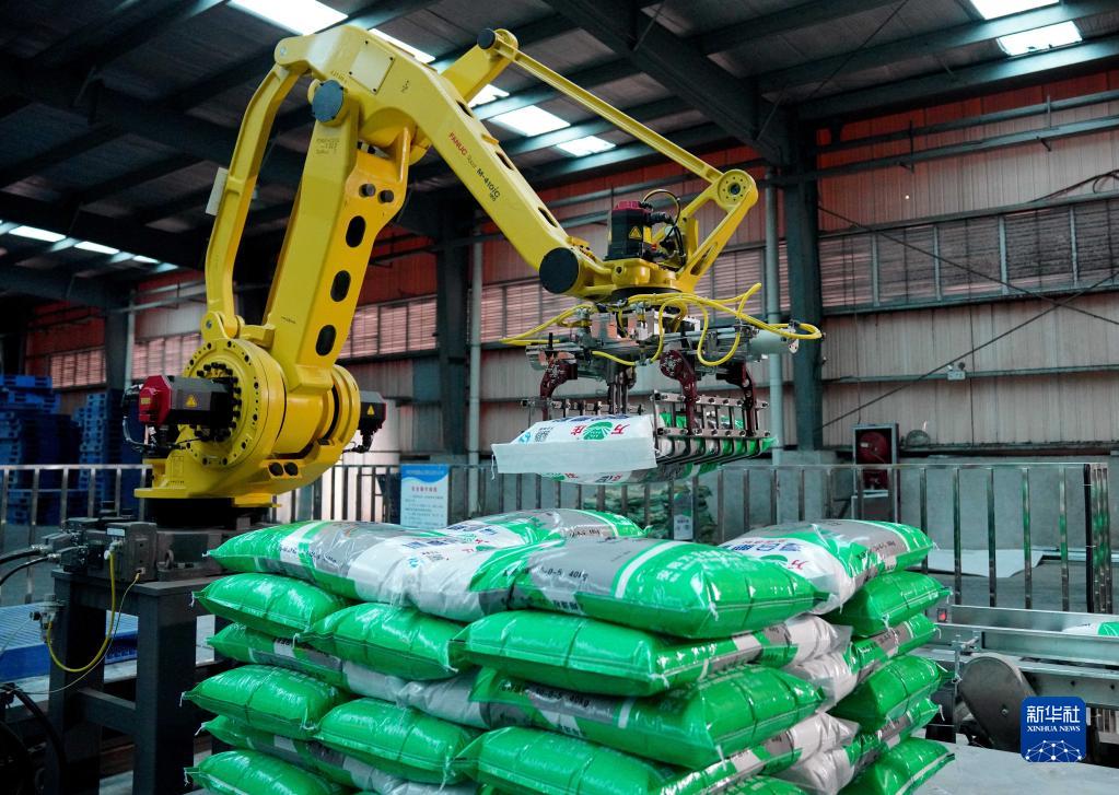 2月8日,在安陽萬莊公鐵物流園,機(jī)器人碼垛系統(tǒng)對袋裝化肥進(jìn)行碼垛作業(yè)。