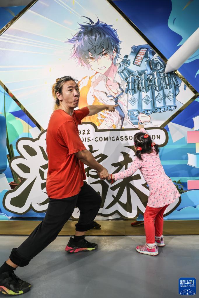 2月9日,在海口市龍橋鎮昌學村的“燚界·漫創社”創業孵化基地展廳內,漫畫家“極樂鳥”(左)和孩子在自己的動漫作品前合影。
