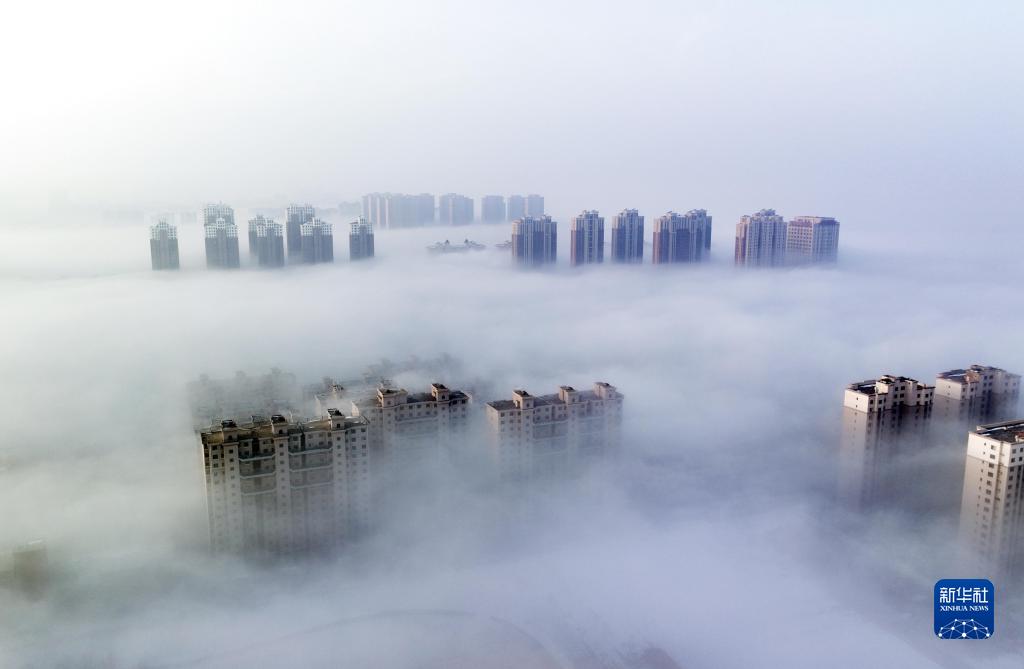 當日,寧夏銀川市出現平流霧景觀,城市建筑若隱若現,如夢如幻。