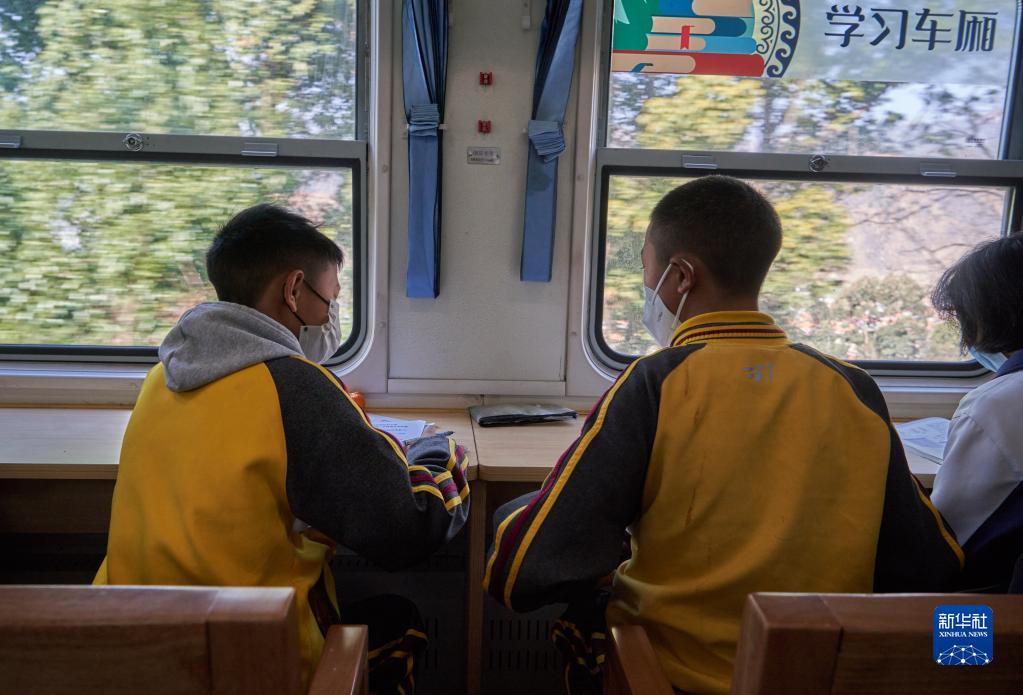 2月9日,學(xué)生在5633次列車(chē)上的學(xué)習(xí)車(chē)廂交流。