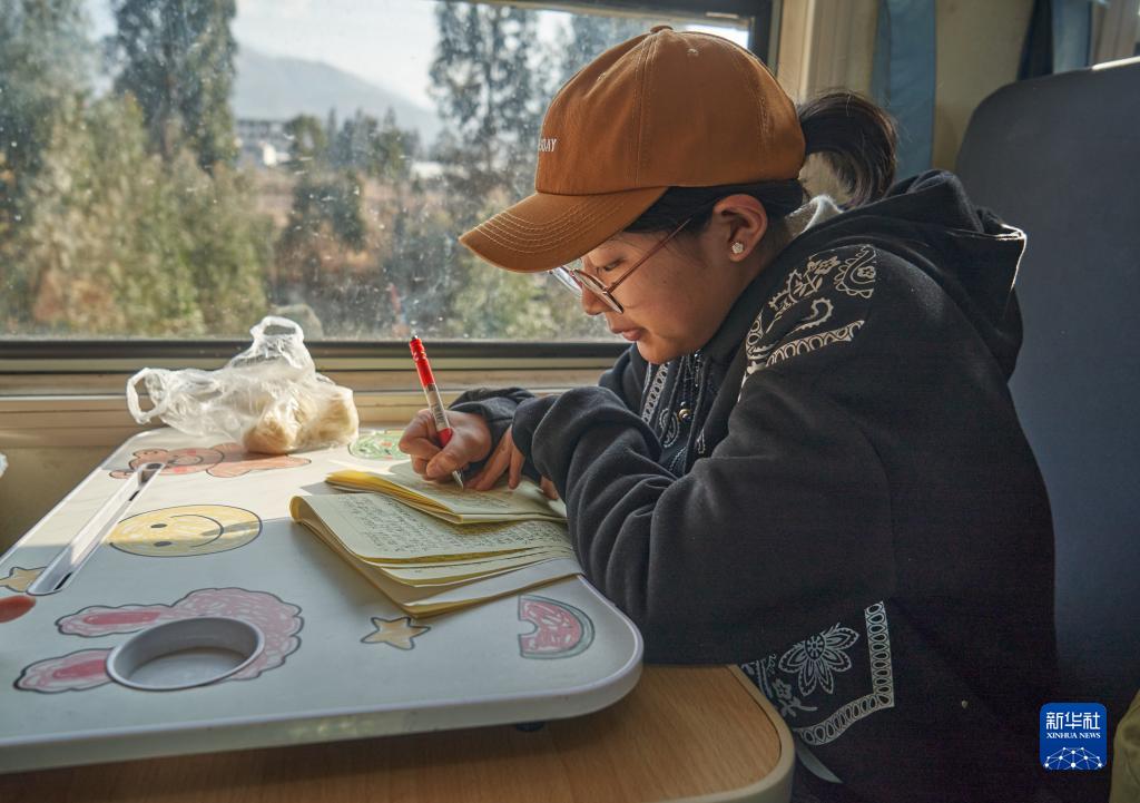 2月9日,學(xué)生在5633次列車上寫作業(yè)。
