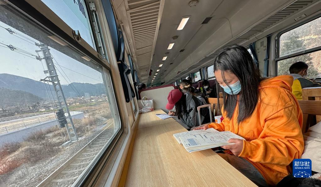 2月9日,學生在5633次列車上讀書。