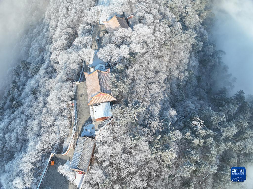 當日,雪后的河北唐山市遷西縣出現云海霧凇景觀,山峰、樹木、古建筑在云霧中時隱時現,美如畫卷。
