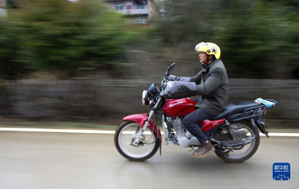 江西宜春袁州區楠木鄉官溪小學教師賴小田在騎摩托車上班途中(2月9日攝)。