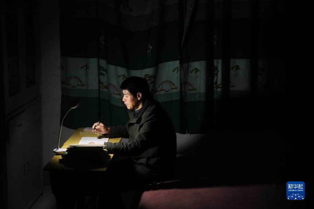 在楠木鄉官溪小學,賴小田家訪后返回學校,在宿舍里批改作業(2月7日攝)。