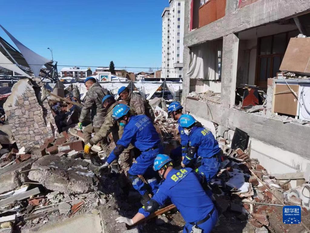 2月10日,在土耳其馬拉蒂亞省,中國藍天救援隊隊員探測到生命跡象后與當地救援人員協作開展救援。