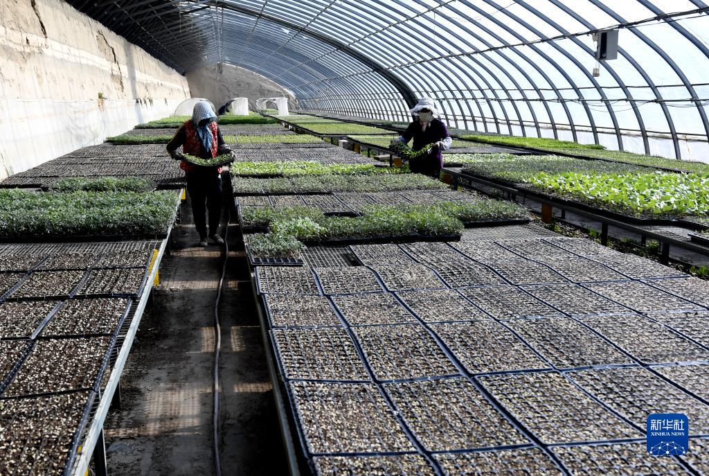 2月10日,在甘肅省永靖縣三塬鎮一家種苗培育基地,農民在大棚里搬運苗盤。