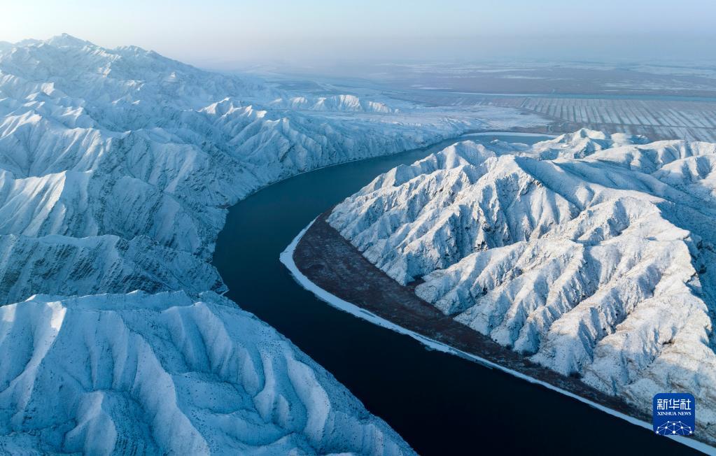 大雪過后,寧夏青銅峽黃河大峽谷銀裝素裹,黃河從峽谷間流過,美如畫卷。新華社發(祁瀛濤攝)