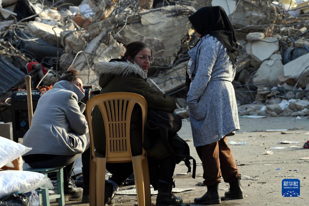 2月10日,人們聚集在土耳其哈塔伊省安塔基亞市的一處地震廢墟旁。