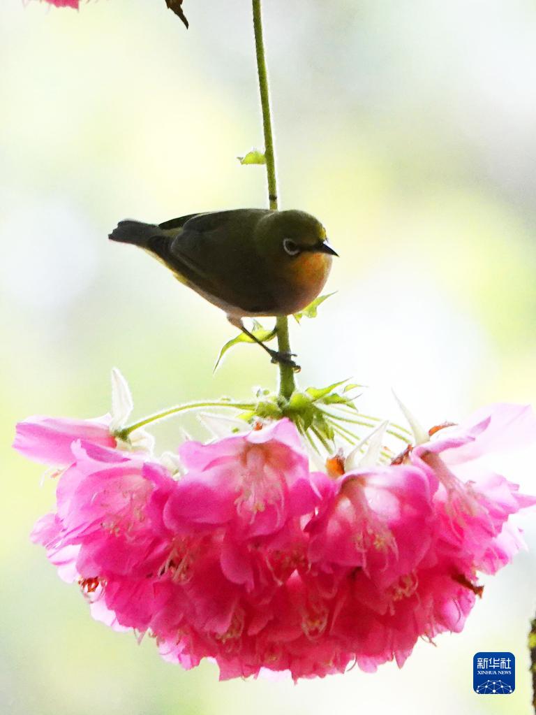 2月10日,在廣西南寧市人民公園,一只小鳥在非洲芙蓉花的枝頭停歇。
