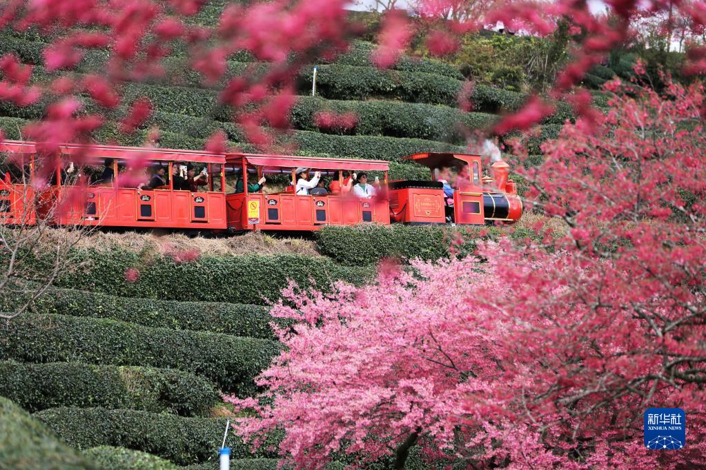 2月11日,游客在福建省漳平市永福鎮櫻花園景區乘坐觀光小火車觀賞櫻花。