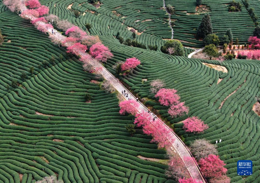 2月11日,游客在福建省漳平市永福鎮櫻花園景區賞花游玩(無人機照片) 。