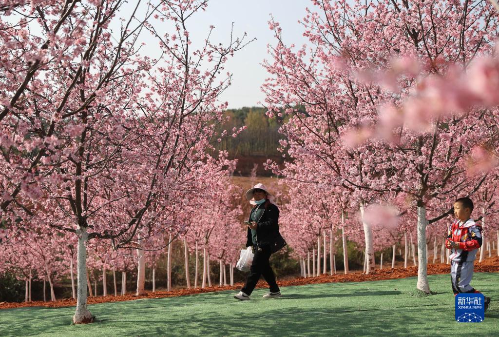 2月11日,游客在云南省昆明市宜良縣山后櫻花谷景區游玩。