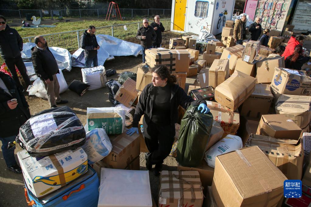 2月9日,在英國倫敦,志愿者準備將人們向土耳其震區提供的援助物資裝車。