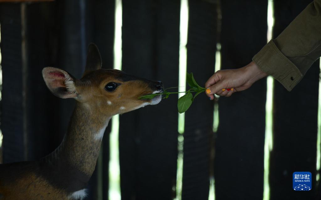 2月4日,游客在肯尼亞納紐基肯尼亞山野生動物保護區(qū)的動物孤兒院內給羚羊喂食。