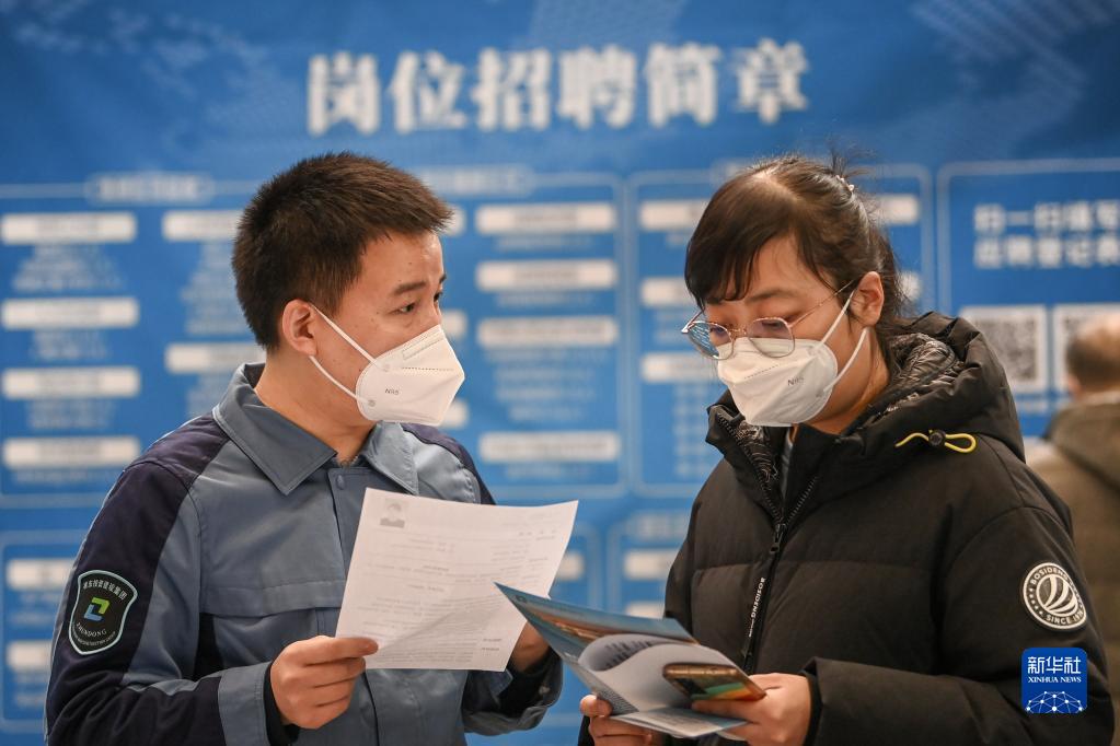 2月11日,在新疆國際會展中心舉行的2023新疆春季人才交流會上,招聘人員與求職者(右)交流崗位信息。