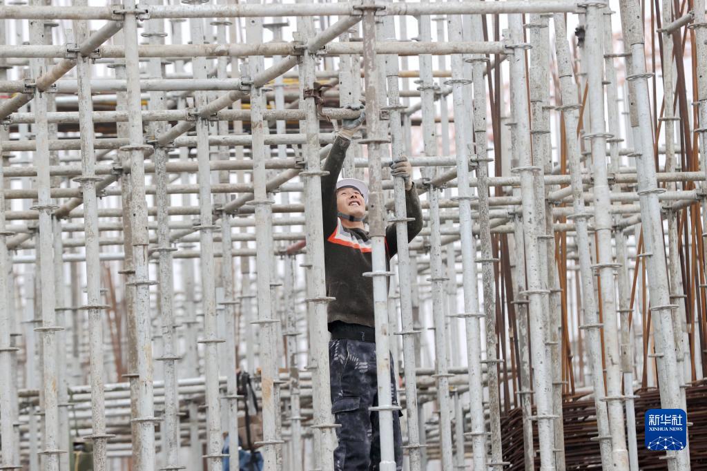 2月11日,工人在浙江省湖州市德清縣康乾街道莫干山智能生態城創新創業產業園項目工地施工。