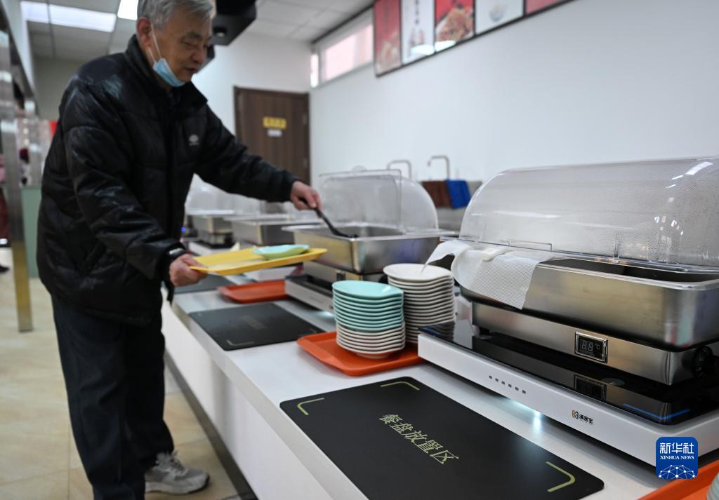 一名老人在天津市和平區南營門街道的老年人“智慧食堂”取餐(2月10日攝)。