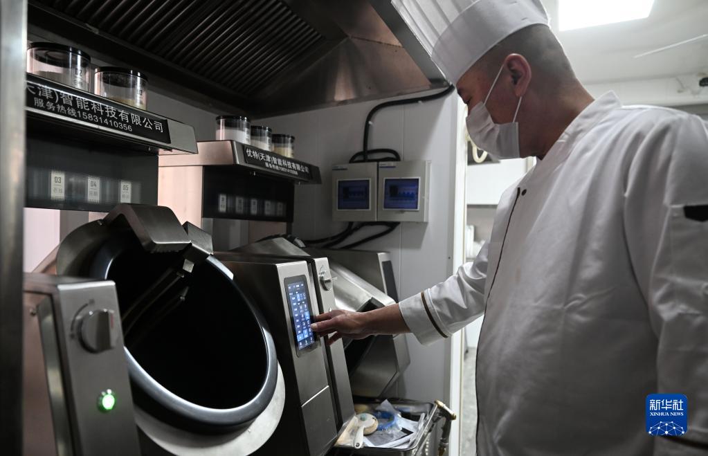 廚師在天津市和平區南營門街道的老年人“智慧食堂”后廚操作炒菜機器人(2月10日攝)。