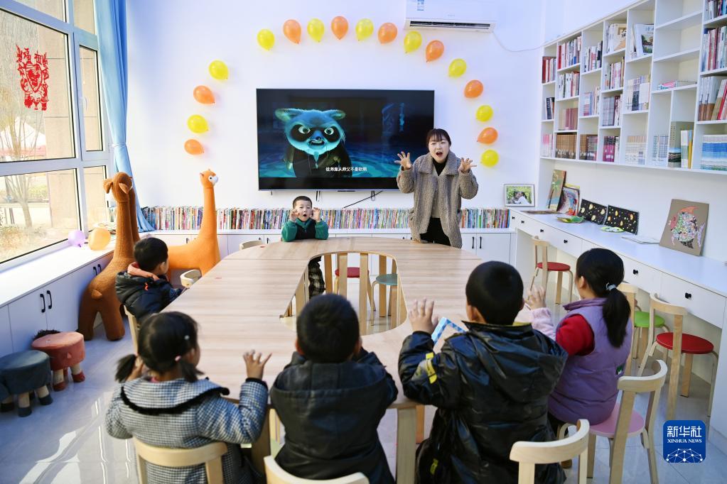在隴南市徽縣虞關(guān)鄉(xiāng)許壩村“幸福家園”,志愿者帶著小朋友唱兒歌(2月11日攝)。