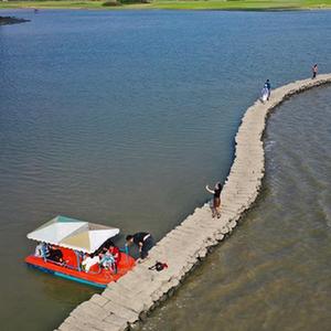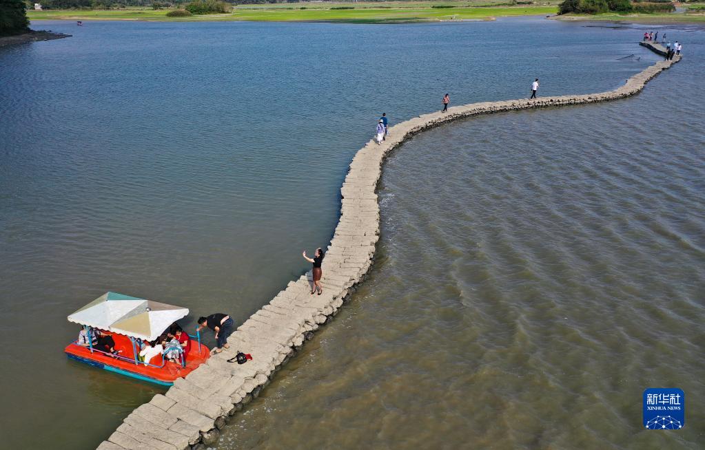 國倉村石橋位于海口市瓊山區龍塘鎮,距今有500余年歷史,因形狀彎曲似蛇,被當地人稱為“蛇橋”。蜿蜒的石橋水漲則沒,水退則顯,一年只在初春至初夏時節露出水面。