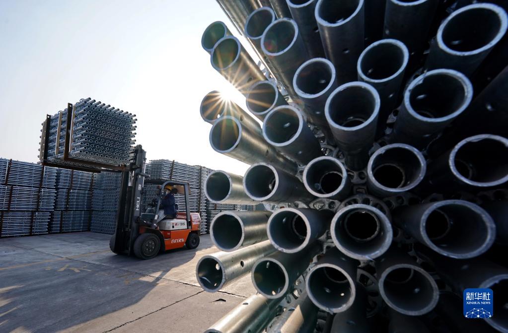 2月10日,唐山市海港經(jīng)濟(jì)開發(fā)區(qū)一家支護(hù)裝備企業(yè)的工人駕駛叉車碼放產(chǎn)品。