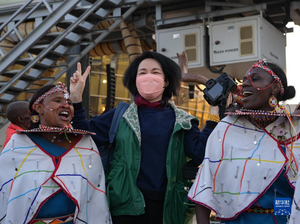 2月11日,在肯尼亞首都內羅畢喬莫·肯雅塔國際機場,中國游客和肯尼亞演員合影。