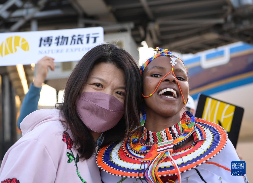 2月11日,在肯尼亞首都內羅畢喬莫·肯雅塔國際機場,中國游客和肯尼亞演員合影。