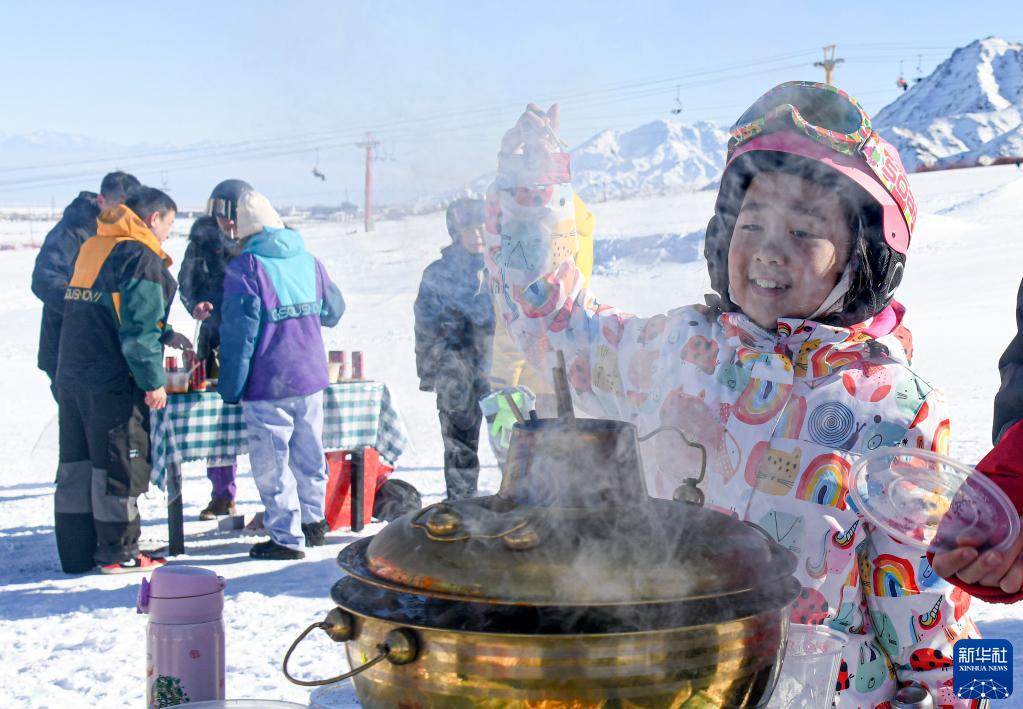 新疆白云國際滑雪場,小朋友在雪場舉辦的冰雪火鍋節上等待品嘗美食(2023年1月13日攝)。新華社記者 王菲 攝