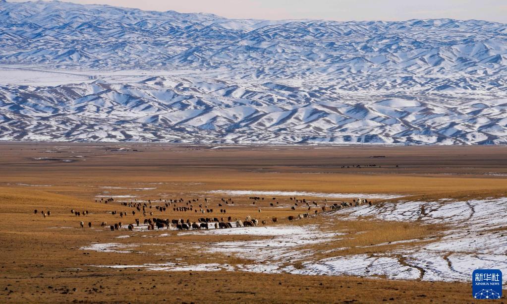 羊群在新疆裕民縣巴爾魯克山冬季牧場覓食(2022年11月4日攝)。新華社發(fā)(陳雙喜 攝)