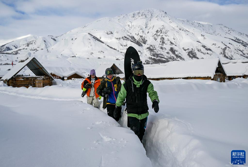 來自廣東的雪友在新疆阿勒泰地區禾木村游玩(2023年1月14日攝)。新華社記者 胡虎虎 攝