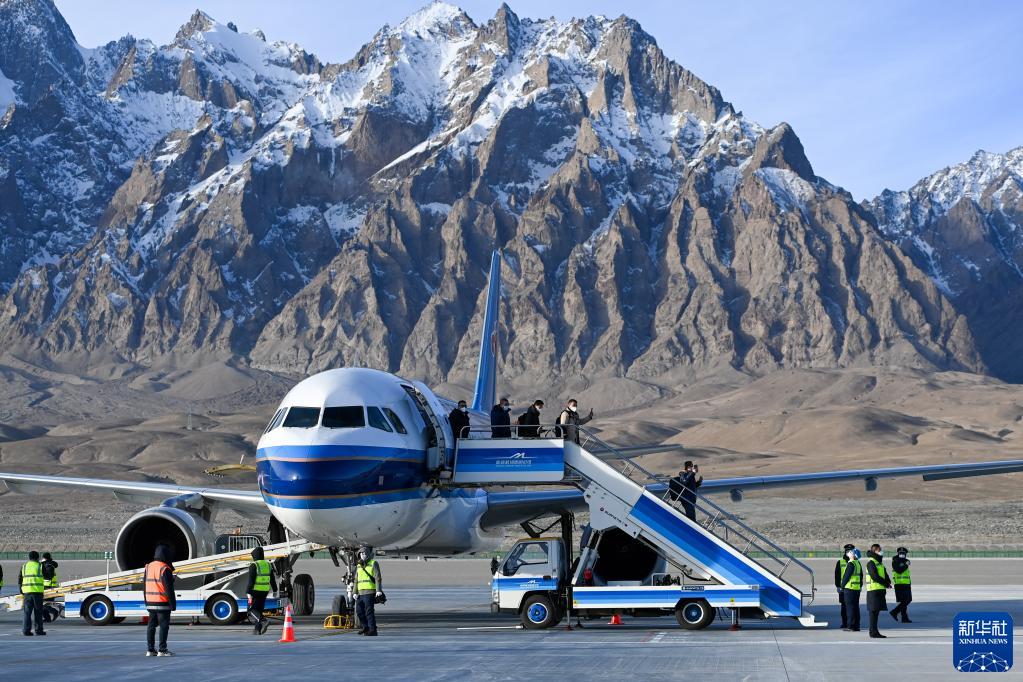 2022年12月23日,巍巍帕米爾高原上,中國最西端的運(yùn)輸機(jī)場(chǎng)——新疆塔什庫爾干紅其拉甫機(jī)場(chǎng)正式通航,冰山上迎來首批“空中來客”。新華社記者 丁磊 攝