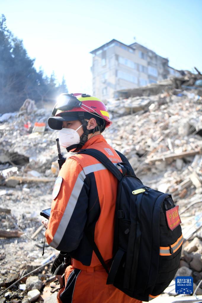 2月11日,中國救援隊隊員在土耳其哈塔伊省安塔基亞市一處地震廢墟開展救援工作。