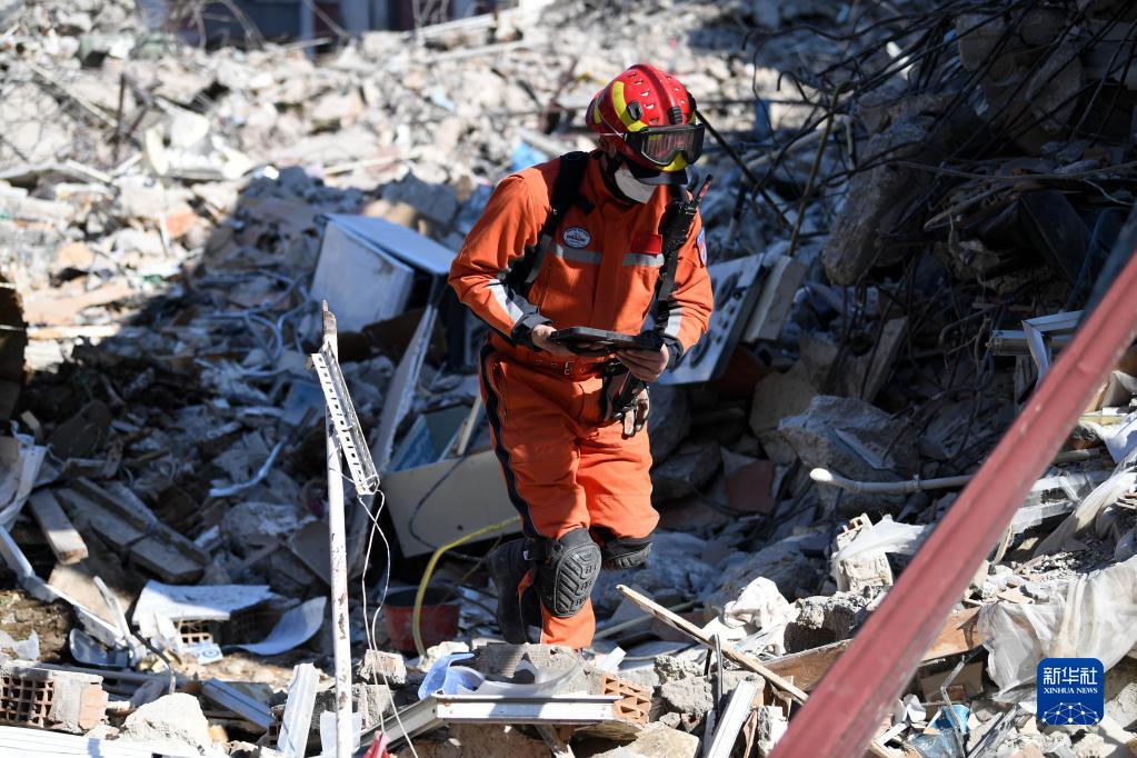 2月11日,中國救援隊隊員在土耳其哈塔伊省安塔基亞市一處地震廢墟開展救援工作。