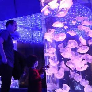 2月11日,一位小朋友跟隨家長在沈陽皇家海洋樂園里觀看水母。