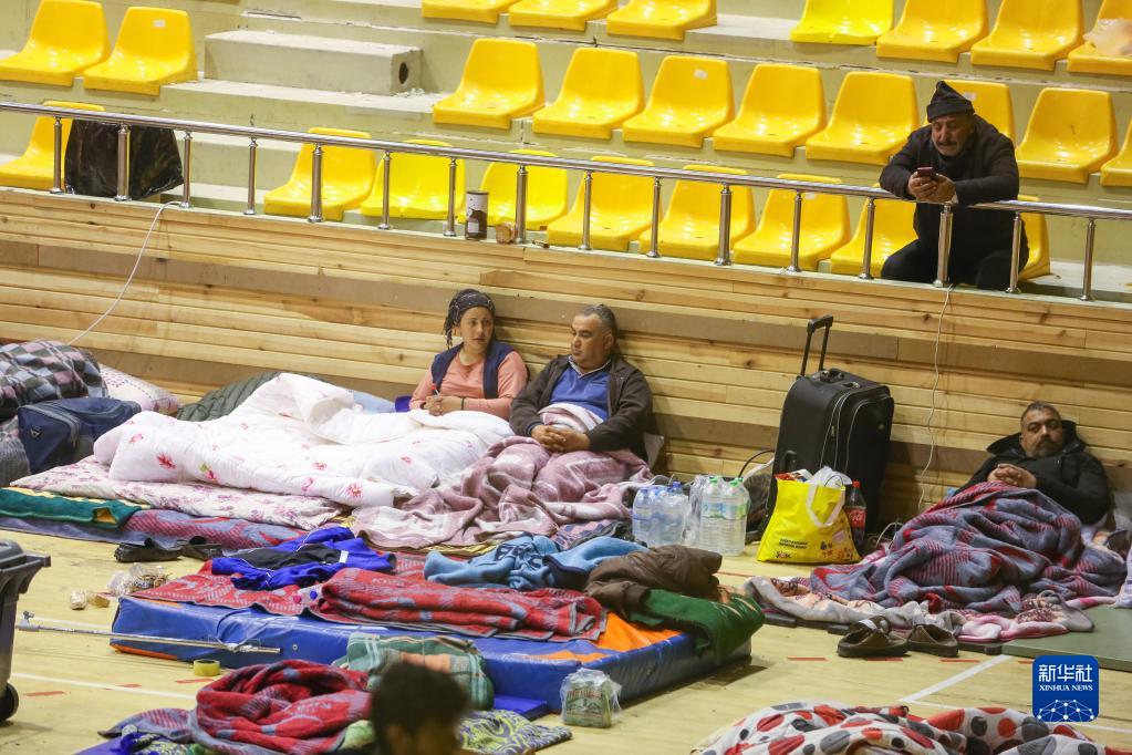 2月11日,受地震影響的人們在土耳其哈塔伊省安塔基亞市的一個體育館休息。