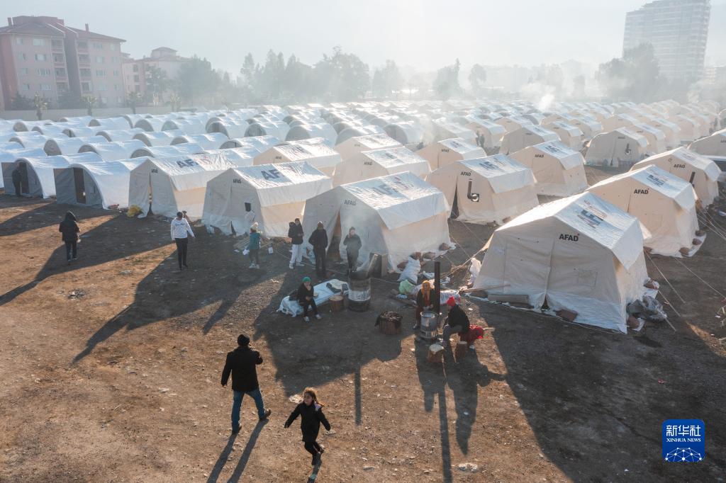 2月11日,在土耳其哈塔伊省安塔基亞市,受地震影響的人們在帳篷外休息(無人機拍攝)。