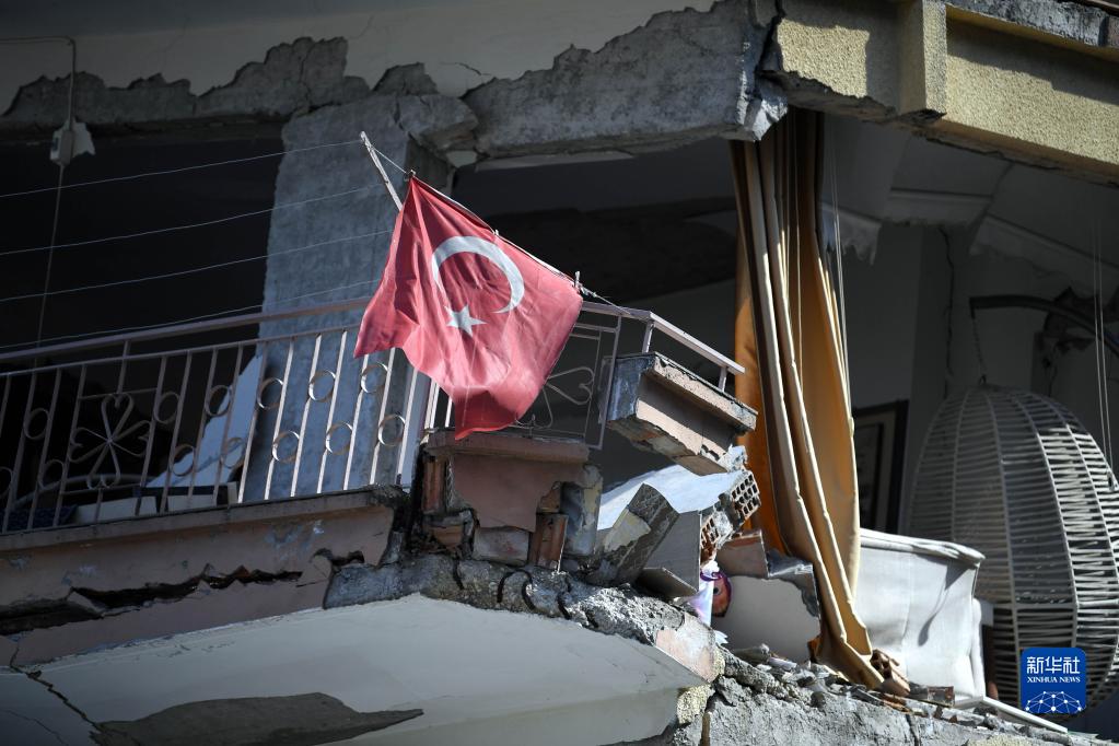 2月11日,在土耳其哈塔伊省安塔基亞市,遭地震損毀的建筑上懸掛著土耳其國旗。
