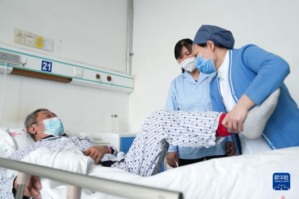 在北京市房山區(qū)良鄉(xiāng)醫(yī)院神經(jīng)內(nèi)科三病區(qū),一位護(hù)士(右)為新上崗的薛四四(中)講解科內(nèi)病人護(hù)理的一些知識(shí)(2月10日攝)。